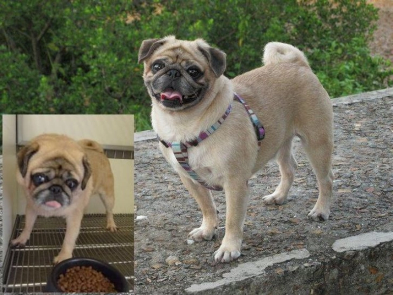 La première photo de Patches montre un carlin encore hésitant. Plus tard apparaît un compagnon sûr de lui, posture équilibrée, expression douce. Partagé en ligne, le contraste prouve que patience, soins structurés et affection transforment un animal mis de côté en membre central.