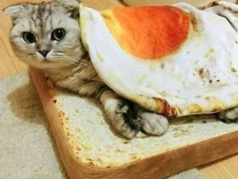 C'est juste un chat assis sur un coussin en forme de pain.