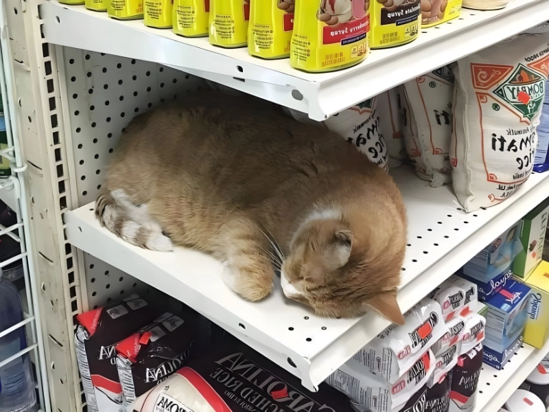 La légende dit "Dieu merci ils sont de retour en rayon" parlant du chat orange dormant sur une étagère. Ce chat a l air du patron ou d un employé exténué.