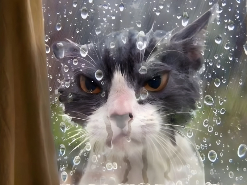Ce chat paraît très contrarié après l averse ce qui se comprend. À voir son expression il est prêt à une sérieuse discussion avec ses humains une fois rentré.