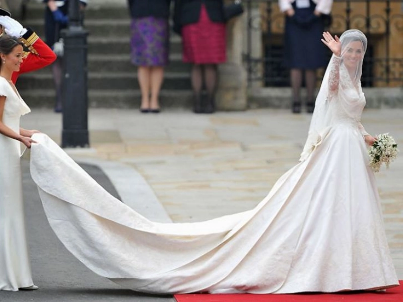La Robe Iconique d’Alexander McQueen portée par Kate Middleton La robe de mariage de Kate Middleton, conçue par Sarah Burton pour Alexander McQueen, était un chef-d'œuvre de dentelle et d'artisanat. La traîne gracieuse et la silhouette magnifique en ont fait l'une des robes royales les plus mémorables, inspirant les mariées du monde entier.