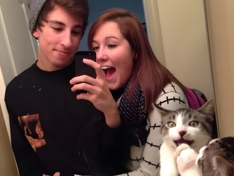 Les animaux de compagnie sont adorables, et ce selfie le prouve. Les chats adorent particulièrement imiter leurs propriétaires et participer à l’amusement. Ce couple essaie de capturer un moment doux, et leur chat copie leurs gestes. Peut-être que le chat veut juste participer ou est heureux de les voir ensemble.