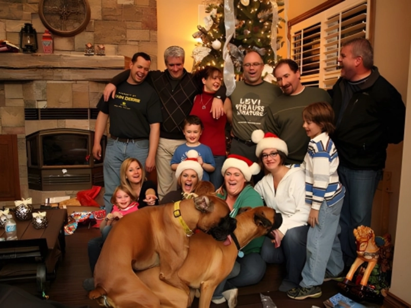Cette photo de vacances familiale maladroite présente deux chiens qui ont pris l’esprit de Noël un peu trop au sérieux. Peut-être qu’ils ont eu leurs cadeaux tôt ! Personne ne les a arrêtés—ils voulaient juste continuer la fête. Au moins, leurs pitreries ont fait sourire sincèrement leurs humains. Parfois, l’humeur prend le dessus et il faut juste suivre le mouvement.