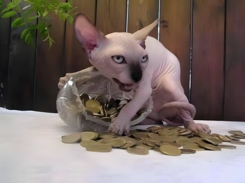 La scène ressemble à quelque chose d’un film de braquage excentrique, avec un chat Sphynx sans poils comme chef de bande. Le regard intense du chat et sa posture protectrice sur les pièces créent une image bizarre mais amusante. Sa peau ridée et son absence de poils ne font qu’accentuer le drame, le faisant ressembler à un gardien mythique de trésors. Tant de questions se posent : ce chat accumule-t-il des pièces depuis longtemps ? Où les a-t-il obtenues ? Est-ce une sorte de compte épargne félin ? La posture du chat suggère qu’il est prêt à défendre son butin, nous rappelant que les chats ne cessent de nous surprendre avec leurs habitudes étranges et leur compréhension apparente des idées humaines—comme la valeur de l’argent.