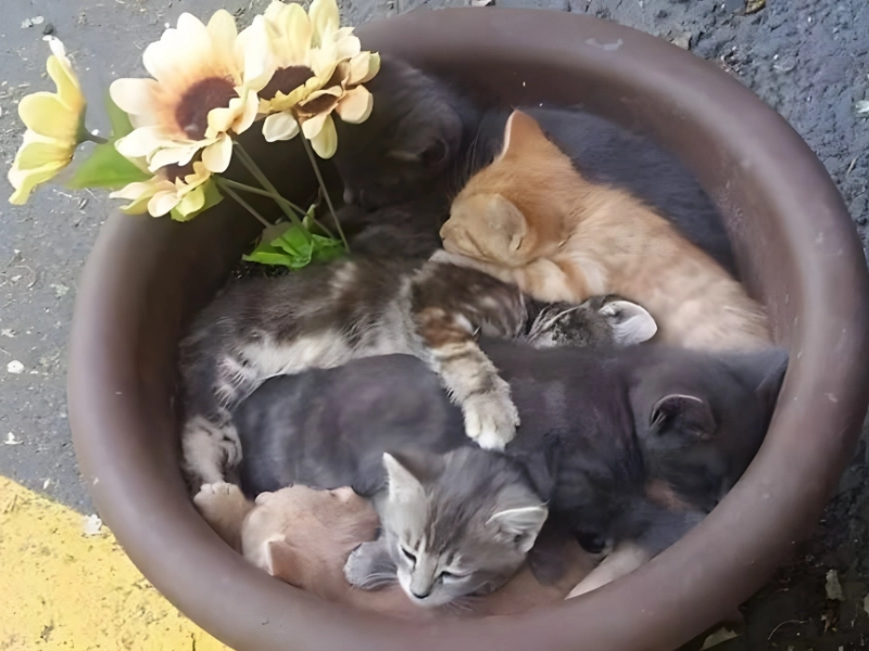Le pot de chats montre à quel point les chats partagent facilement l’espace et le confort les uns avec les autres. Cette image est l’une des plus mignonnes jamais vues, rendue encore plus douce par les fleurs suspendues au-dessus—vraiment la touche finale parfaite ! Conclusion