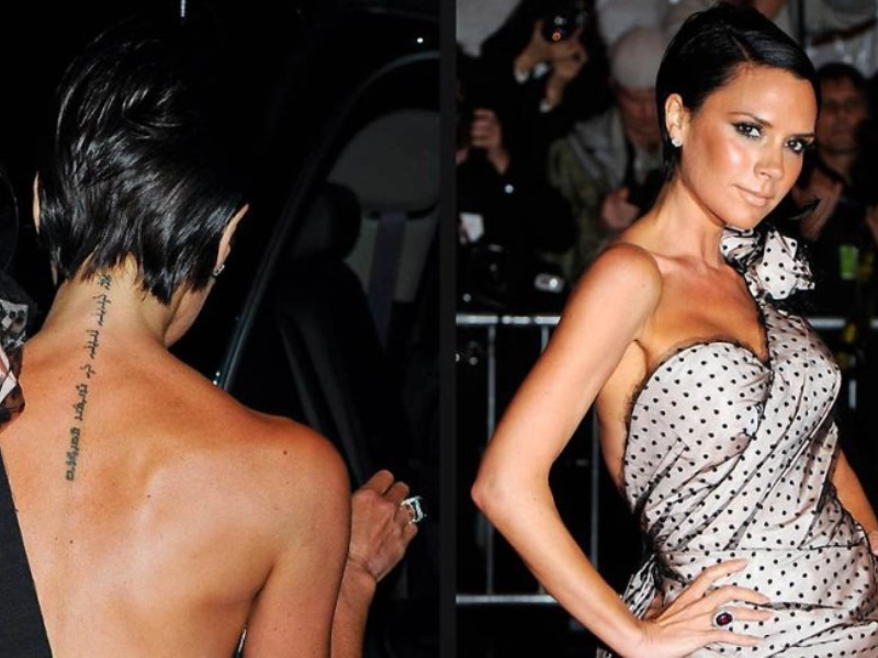 Victoria Beckham porte en hébreu Je suis à mon bien aimé et mon bien aimé est à moi. Phrase de fidélité et d engagement envers famille et époux. Autour du cou elle rappelle valeurs et importance de l amour.