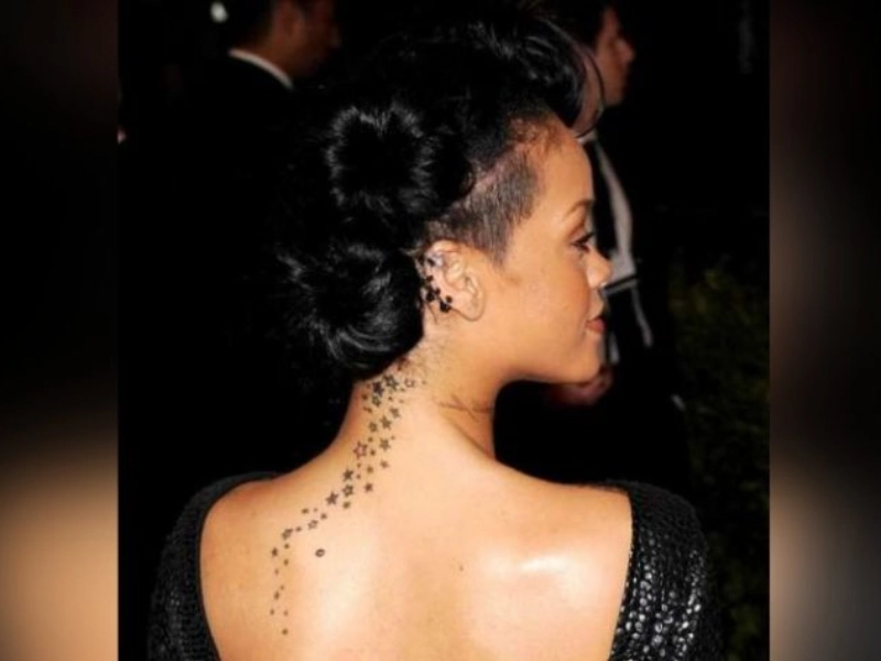 Parmi ses tatouages célèbres un motif d étoiles qui descend du cou vers le dos. Ce dessin apporte élégance et rêve symbolisant espoirs et ambitions. Les étoiles évoquent les possibilités infinies devant elle. Rihanna porte aussi une petite note de musique sur la jambe droite discrète preuve de son lien profond avec son art.